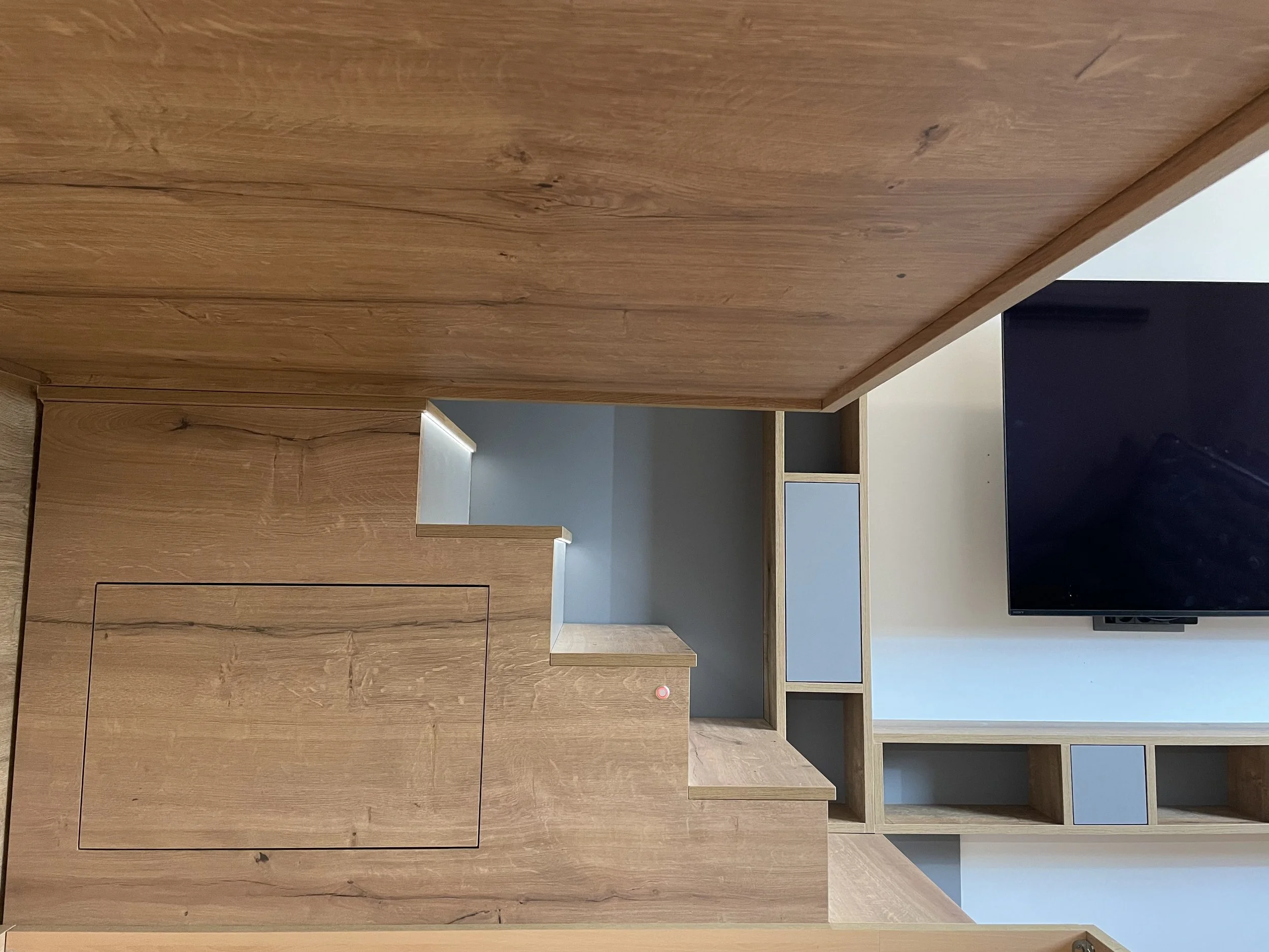 Spalnica, kjer je praktično vsak element drugačen in ima vsak povsem drugačno funkcijo. Eden izmed najbolj zahtevnih ter zanimivih delov tega projekta so stopnice, kjer sta pod prvima dvema nastopoma tip-on predala, pred posteljo pa se nahajajo zelo dobro skrita tip-on vratca omare, za res moderen videz pa poskrbijo led luči pod nastopi.